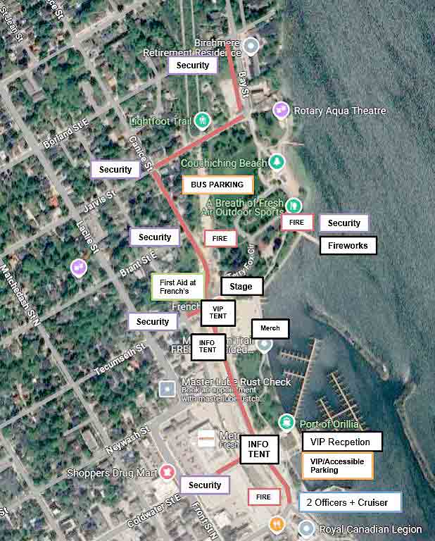 This will also mean rerouting Orillia Transit service, but staff recommend special event transit stops somewhere near the contained area will be set up to encourage people to use the bus to get to the event (which also features fireworks).