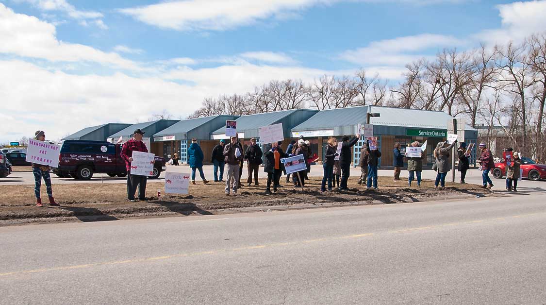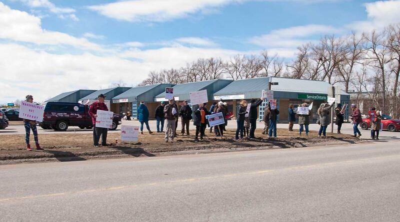 (Photos by Swartz – SUNonline/Orillia) Main: Early bird protesters at March’s protest against actions by the Ontario government.